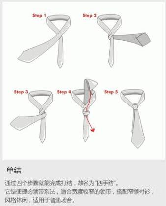 它们的不同在于前者有两个结,即两圈。这种结适合个子矮小的男士, 它适合意大利领和稍细的领带且简单易做。