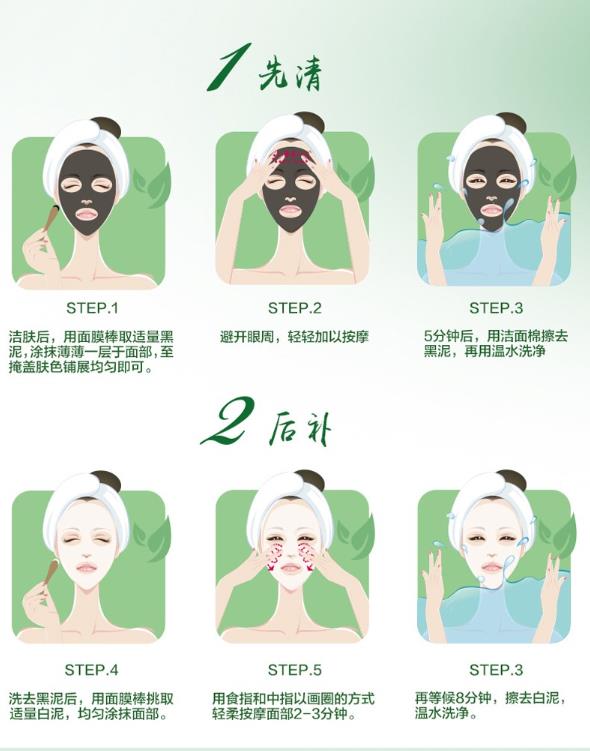 1. 先清:首先使用黑泥,清洁双手并擦干,用面膜调棒取适量黑泥,涂抹薄薄一层于面部,至掩盖肤色铺展均匀即可,注意避开眼部周围。加以轻轻按摩,使黑泥中的本草成分渗透并作用于肌肤。约5分钟后,用洁面棉擦去黑泥,再用温水冲洗干净。