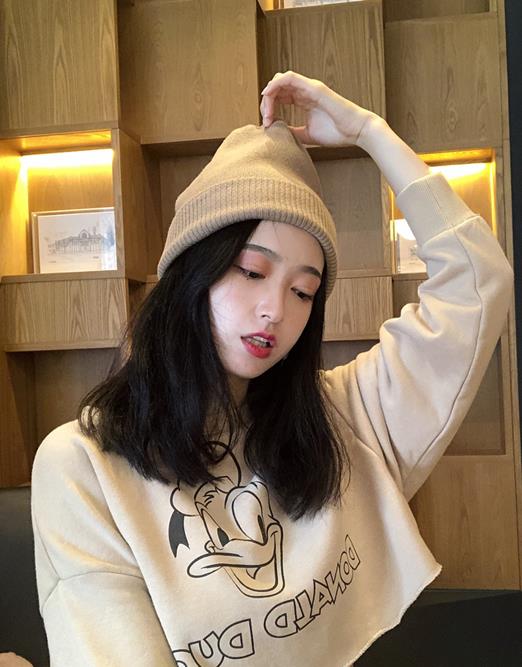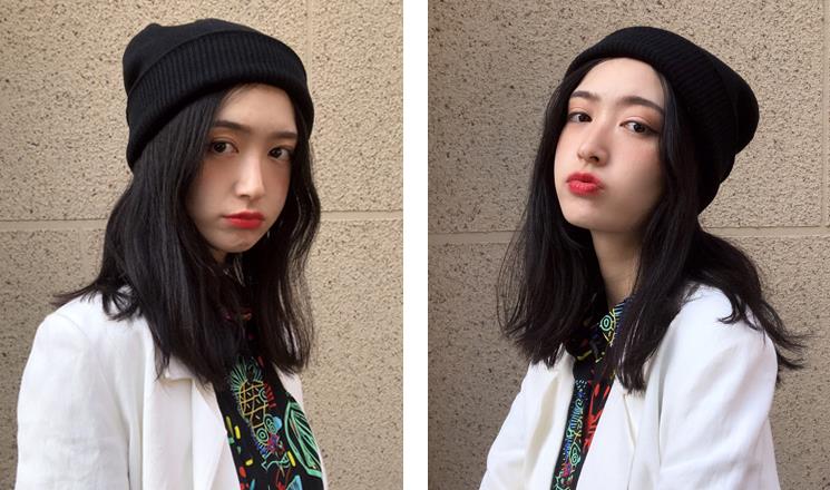 2. 不留刘海的情况,把针织帽前面的往下戴一点,到发根的位置,这样就比较稳了;留刘海的情况,如果头发比较长、比较多,就往针织帽里面塞一点,或者给针织帽里面加松紧带。