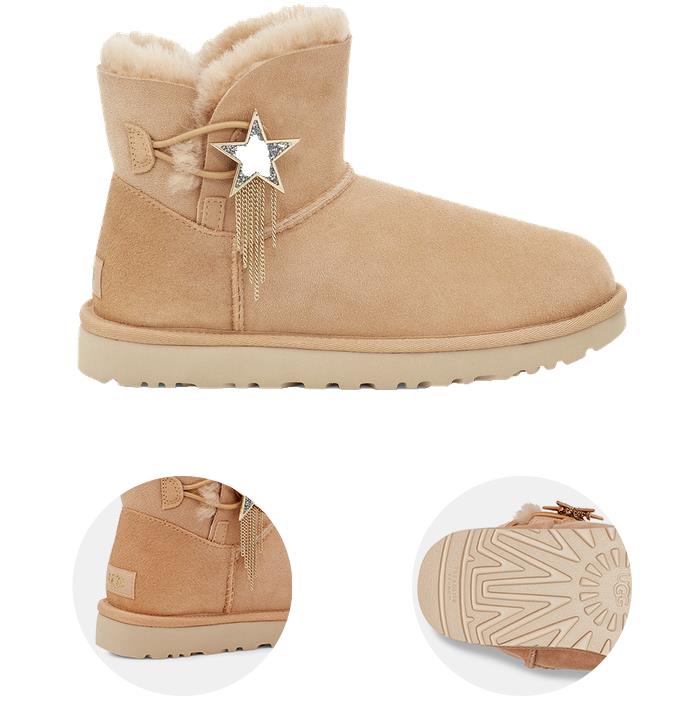 起源于1978年南加州海滩的UGG品牌一直是美国高端时尚生活方式的国际知名品牌。UGG材质上乘,工艺精湛,带来一年四季的鞋履、服饰、配饰、箱包及家居类全线产品。这种羊皮靴从1910年开始在剪羊毛人中变得流行,剪羊毛人从羊的身上取下一小块羊皮,经过修剪后,用来包住他们的脚,他们称这种鞋为丑陋的靴子。一战时,澳大利亚飞行员用两块羊皮包裹成鞋子穿在脚上御寒,后来逐渐在澳洲流行开来。想当年,澳洲空军首先发现了雪地靴的奇妙功能,它内里是羊毛,外边是鞣制过的无比轻软的羊皮,所以,雪地靴就被澳洲空军指定制作专用的军靴,一度地它被称为FUGG。