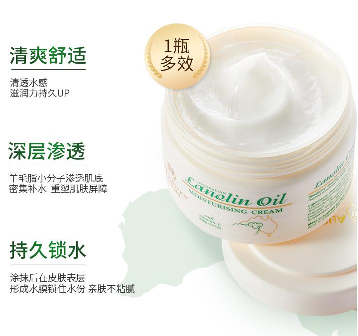 绵羊油美容霜则以绵羊油为主,添加其他物质,具有保湿,防皱美白,滋养效果,防止皮肤老化干燥 绵羊油在澳洲甚至全世界都有着“神奇的绵羊油”的美誉,具有非常好的渗透,吸收,消炎,排毒保湿滋润功效。