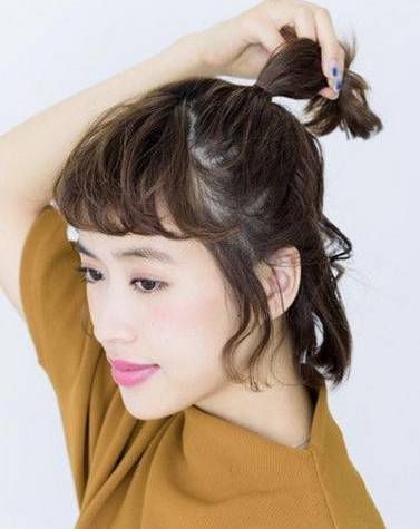 扎发发型半丸子头在今年也是火到不行。就这款自然黑色头发配上短直发很是时尚潮流,再在头顶上扎个小丸子头都了几分俏皮感,同时还很减龄显嫩,值得短发妹纸们尝试起来。