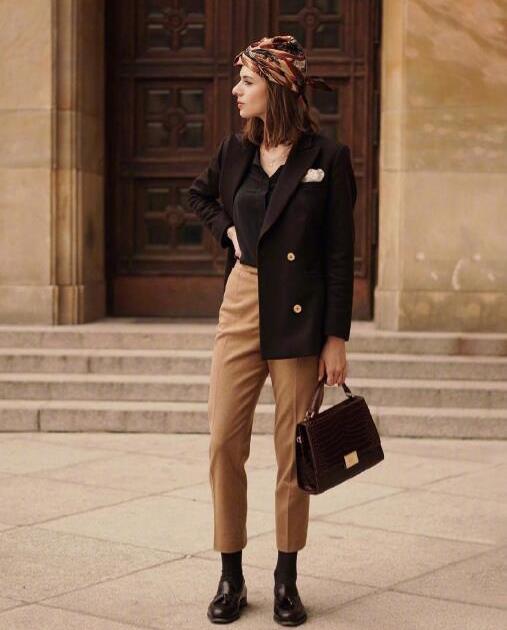秋冬最爱的搭配是什么,那必然是软糯的毛衣和飒飒的西装了。外套是一件版型挺阔的黑色西装,内搭选择了一件白色的衬衫,打底衫是黑色的,下装选择的是一条卡其色的西装裤,版型很好,上身很板正,比较适合高个子的姐妹。
