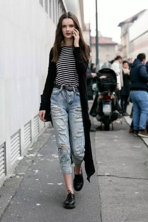 look3 高腰的黑色短上衣+直筒牛仔裤+黑色靴子 利落大方的短靴透出干练和小帅气,显瘦的蓝色小腿裤牛仔裤搭配黑色的高腰的短上衣,整体拉高了腰线,视觉上显高显瘦。搭配个斜跨包包还有点小甜。