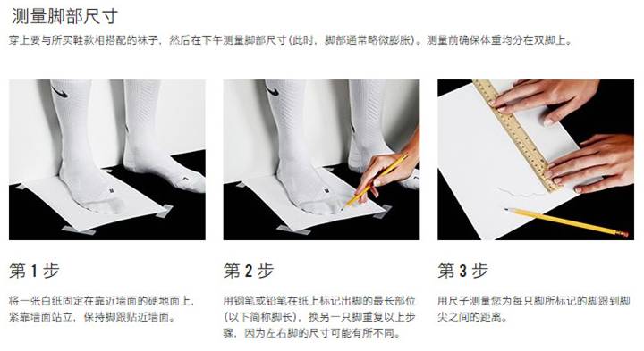 2.耐克nike男鞋中码标准采用厘米数,即测量脚长的长度。如:26.7cm的脚长,对应的欧码是43、英码是8.5、欧码是9.5。