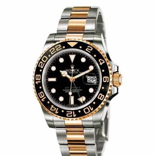 劳力士格林尼治型II系列腕表,间金款腕表,劳力士的金表是最有名的,和其坚固耐用的特质一样出名,也有这么一个说法,买金表就要买劳力士的。这款间金腕表采用的为40毫米直径设计,表壳及表带都采用的为18K黄金-不锈钢打造,不锈钢部分采用拉丝处理,美观时尚。