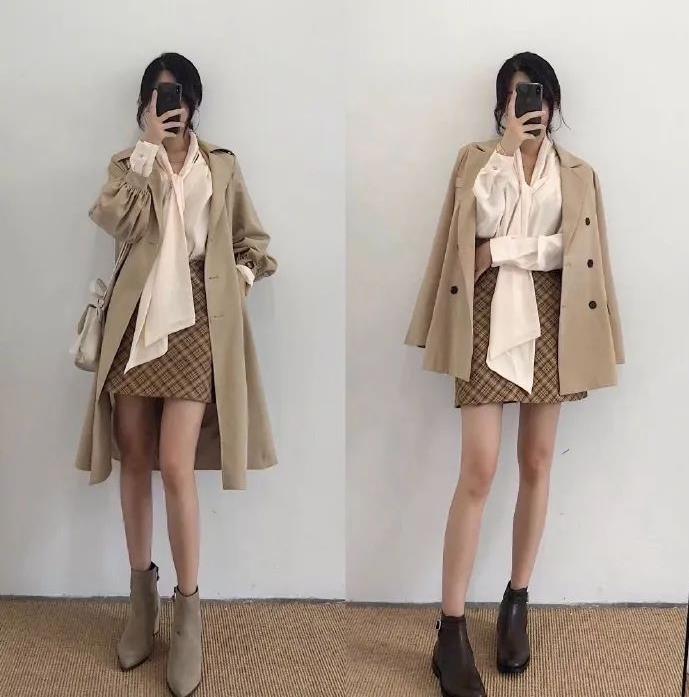 浅卡其色的风衣外套,长款的版型设计让女生穿起来时尚又显气质,内里搭配的蓝色高领毛衣,保暖又好看,再加上一款半身裙搭配,十分好看。