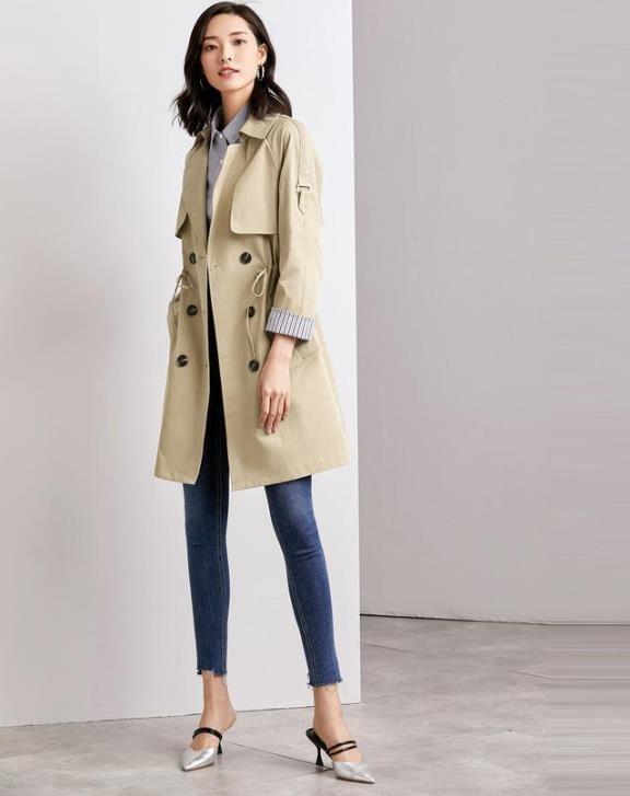 超级好看的一款浅卡其色外套,中长款的版型很好地修饰了女生的身材,而牛仔拼接风衣的设计,更为女生增添了独特的帅气感,内里搭配一件黑色的高领毛衣,简单又不失时尚感!