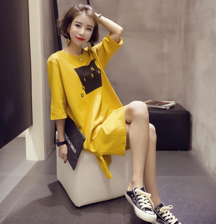 2. 中长款T恤连衣裙 中长款T恤连衣裙也是2019年抖音网红上的小姐姐们带火的一款裙装单品,灰色裙身,宽松的版型,穿起很有随性休闲之感,胸口前字母的点缀,让纯色的衣身不再单调,双侧开叉的设计,能自然减轻走路的束缚感,穿脱方便,夏天懒得搭配,单穿一件就OK了。