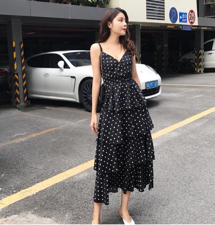 5. 波点吊带连衣裙 波点元素的单品在今年也很受网红小姐姐们的喜欢,以上这款裙身波点造型的连衣裙,腰身上褶皱的设计,上身之后的遮肉效果炒鸡棒,后背裙身上还有着绑带的点缀,甜美可爱中又能透露出一些小性感,不挑人穿,关键的是波点元素还能显肤白,包容强大还减龄好看。