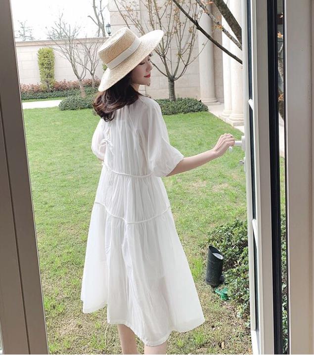 3. 森系系带连衣裙 能将简约文艺跟小众设计气息融合在一起的这款森系连衣裙,整款的裙子单品超级走心,裙身腰部上松紧的抽绳,可以根据每个人的身形自由调节宽松度,袖口上的系带,彰显独特的设计感,多层拼接的A字大裙摆,包容性也很棒,不挑个子还不挑身材,是2019年抖音网红小姐姐们最遮肉显瘦的一款单品。