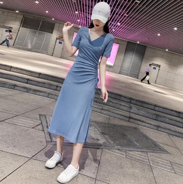 4. 修身抽绳连衣裙 想在这个夏季好好秀出身材的姑娘们,那么一定要选择这款2019年抖音网红的修身抽绳连衣裙款式了,非常有特色的设计可以完美的突出身材上的优点,腰部上特殊的抽绳褶皱设计能巧妙的遮挡住肚子上的肉肉,弧形的裙摆跟荷叶边造型组合起来,妥妥的凹现出大长腿的既视感。