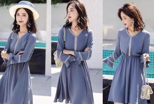 1. 雾霾蓝V领连衣裙 首先安利给大家的这款是2019年网红小姐姐们大热的雾霾蓝V领连衣裙,经典的小V领裁剪不会太露,穿上后能显出好看的脖颈线条,而且还能缩小脸蛋的比例,垂顺度非常好的版型,简约的线条设计,腰间微微修身的装饰,使得它整体款式有着收腰显瘦又藏肉的效果,颜色衬肤百搭穿起来也舒适得体。