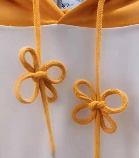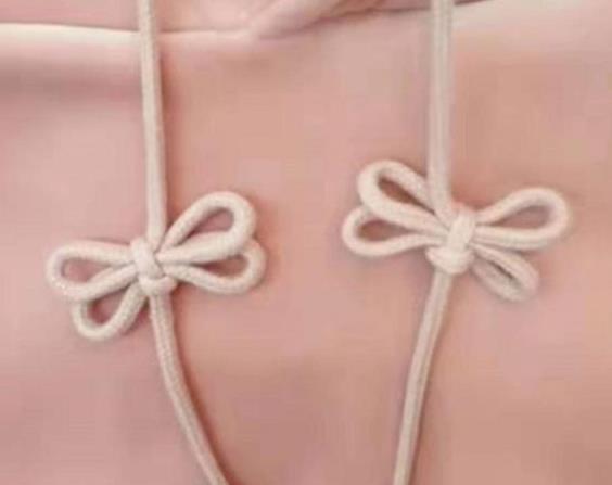 我们可以用不同的方法将卫衣扁绳子打一个圆环、四叶花或者蝴蝶结的形状。
