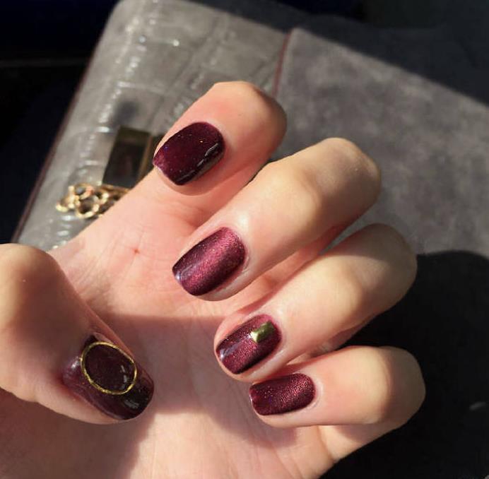 猫眼甲油胶磁铁是将磁铁放在甲面上方1cm,静置10秒,吸出花纹后,立刻用美甲灯照干。猫眼胶是在甲油胶基础上衍生出来的一种新技术,猫眼胶内的磁石粉,会在磁铁的作用下被吸附聚拢。