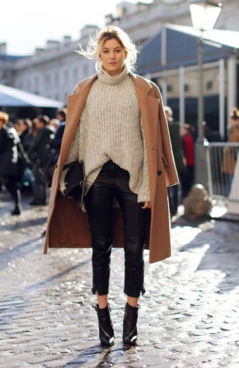 黑色裤子配白色针织打底衫,很百搭时尚。
