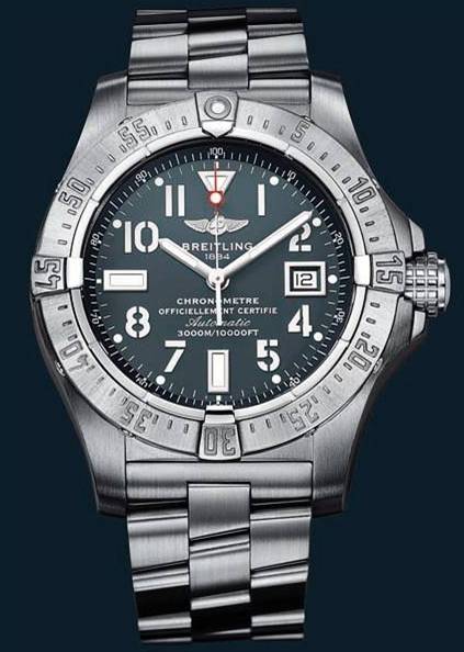 百年灵传承至今的时计精神体现在制表技艺上,包含了四大要素:坚固可靠、功能卓越、精密准确和美学观感。而这款Breitling Aeromarine Superocean超级海洋机械潜水表是百年灵最热销款式之一,采用Breitling 17型机芯,改良自ETA2824-2,有25颗红宝石,动力储备40小时,走时精准,通过天文台认证。配有安全减压阀。蓝宝石防刮防眩目水晶,单向旋转棘轮式表圈,精钢表壳和表链。表径42毫米,作为专业潜水表,其防水能力达到1500米。