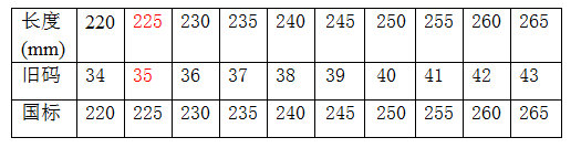 国际码其实就是脚的长。也就是说脚长220mm,对应的国际码就是220。当然你较长223mm,就尽量选择大一码的鞋子,就是225(35码)。