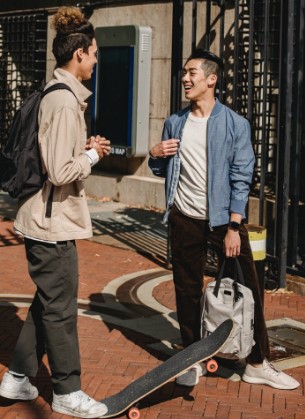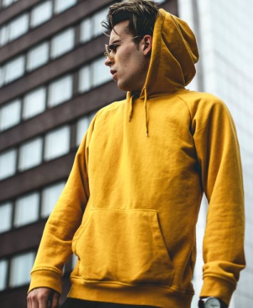 卫衣搭配卫衣的穿法是比较新颖的,我们可以把稍微修身一些的黄色连帽卫衣做内搭,外搭一件宽松版型的黑色圆领卫衣,这样搭配出来既有层次感又显潮流范儿。