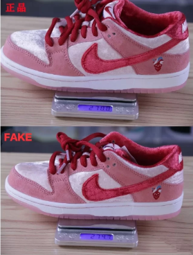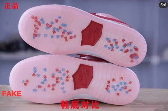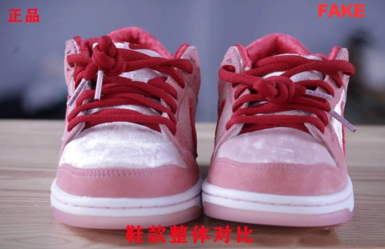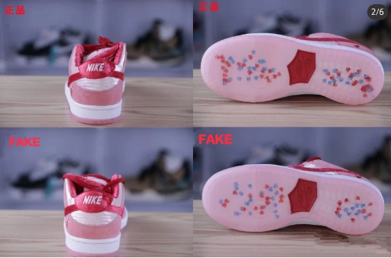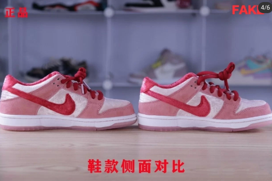 Dunk SB系列鞋款的配色为粉色,受众对象应该为女生,但男生上脚后的效果也完全不来,只不过鞋面的材质是麂皮和天鹅绒的结合,让这鞋子变得更加难打理,所以不是很适合不拘小节的男生。接下来分享一下dunk情人节真假对比。