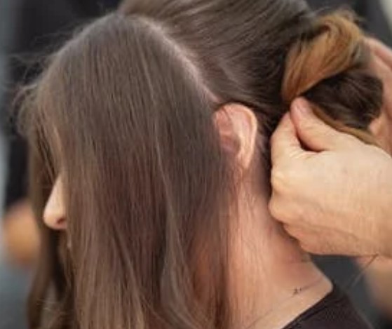 2、把两侧耳朵前面的头发预留出来。