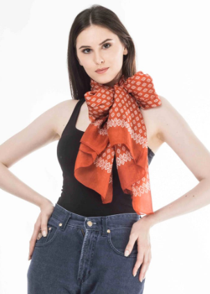 将丝巾对折使两端重叠,然后扭转成麻花状。围在脖子上,把丝巾两端稍微分开。把丝巾的两端分别打结后,穿过另一头的环内。调整角度,将丝巾角展开成漂亮的形状。