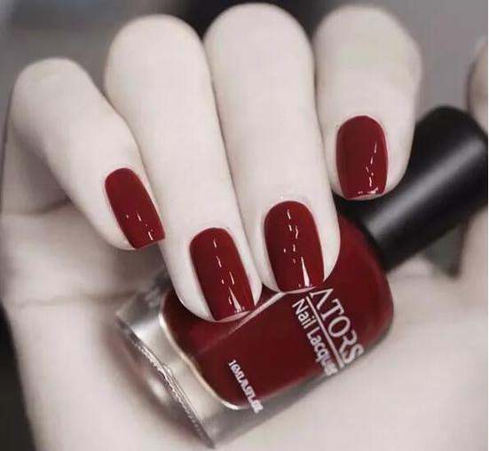 酒红色早已是十分经典的颜色了,这个颜色一直都那么流行不过时,相信大家都知道酒红色的衣服是非常衬托肤色很显白的。所以,酒红色的指甲油也特别显白,能把手部皮肤衬托得更加白皙哦!酒红色指甲油完全不挑人,无论是手部皮肤黑黄,还是手型不好看都可以尝试。