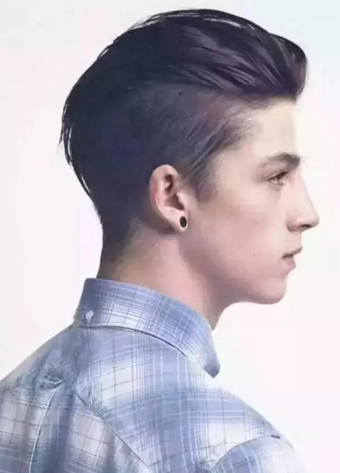 这款发型的重点是两鬓和刘海,两鬓剪平,刘海蓬松斜梳,整个造型给人的感觉是精神又帅气,还蛮有时尚感的。