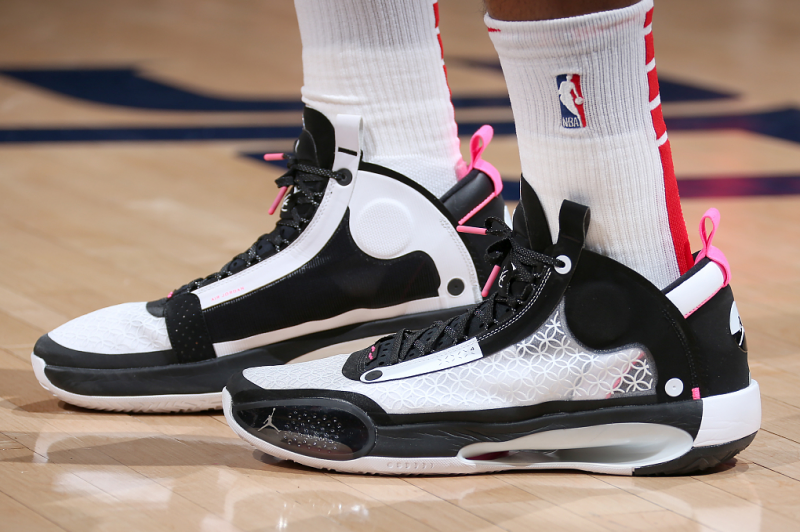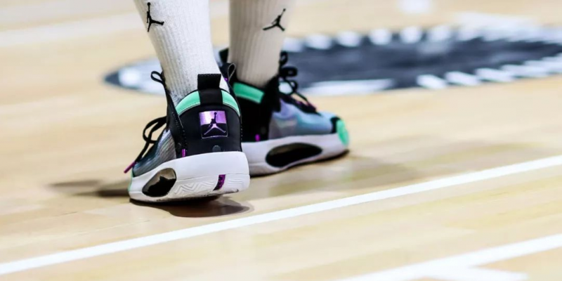 AJ34的外底 Zoom Air 与 JUMPMAN LOGO 为塑料材质,日常穿着需多加注意。AJ34中底全新镂空Pbex支撑片,韧性是普通TPU的2倍+, 镂空处还可以看见巨大的ZOOM AIR,是非常骚气的一个细节。