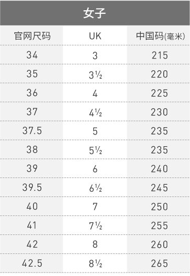 2. Adidas阿迪达斯女鞋中码标准采用毫米数,即测量脚长的长度。如:215mm的脚长,对应的英码是3、官方网尺码是34。