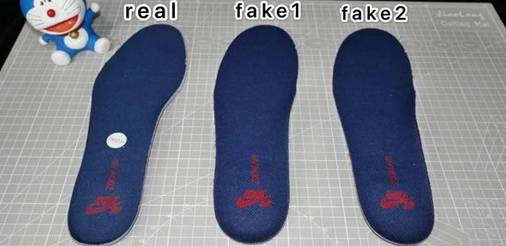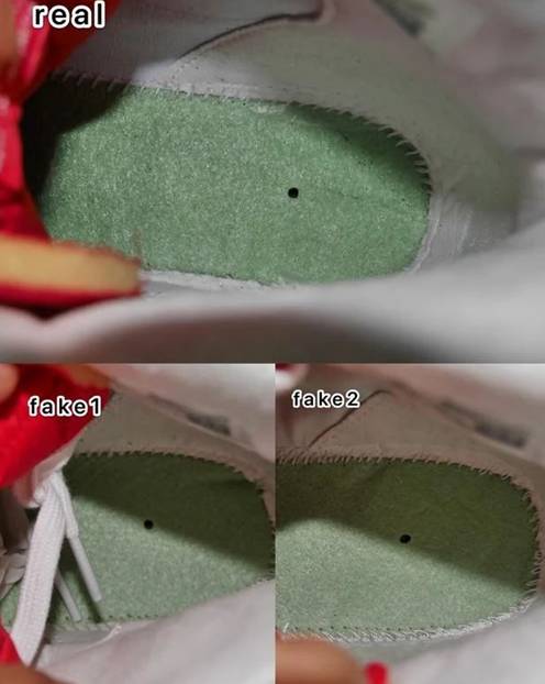 都是淡绿色的中底面,走线fake1要比fake2更加工整一些。注胶孔位置三双鞋相差无几。另外红色鞋舌夹层海绵是淡黄色的,市面很多fake都呈现白色,这一点三双fake并无大差别!