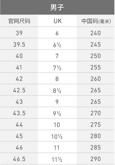 2.Adidas阿迪达斯男鞋中码标准采用毫米数,即测量脚长的长度。如:265mm的脚长,对应的英码是9、官方网尺码是43。