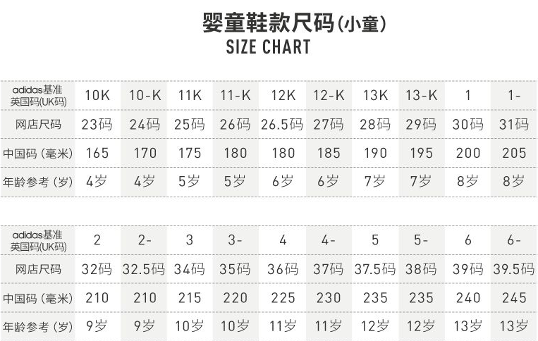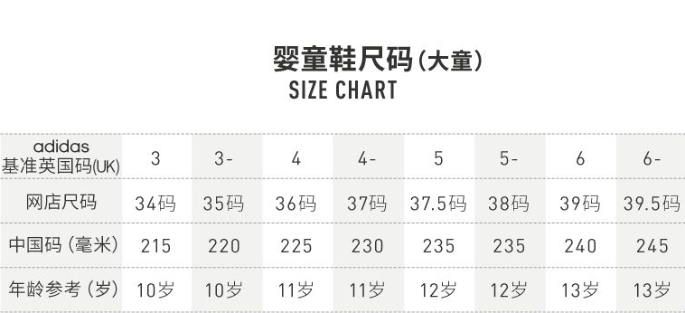 Adidas阿迪达斯童鞋尺码对照表