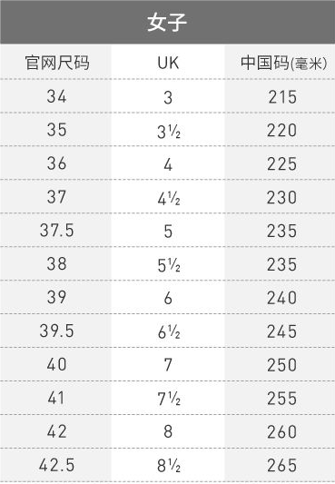 2. Adidas阿迪达斯女鞋中码标准采用毫米数,即测量脚长的长度。如:215mm的脚长,对应的英码是3、官方网尺码是34。