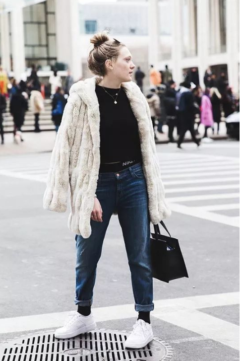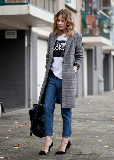 5. 尼外套+修身长裤 暖和又百搭的尼外套是秋冬标配,每个姑娘衣柜里都会有一件,简简单单的搭配上一条修身长裤就既保暖又时尚。