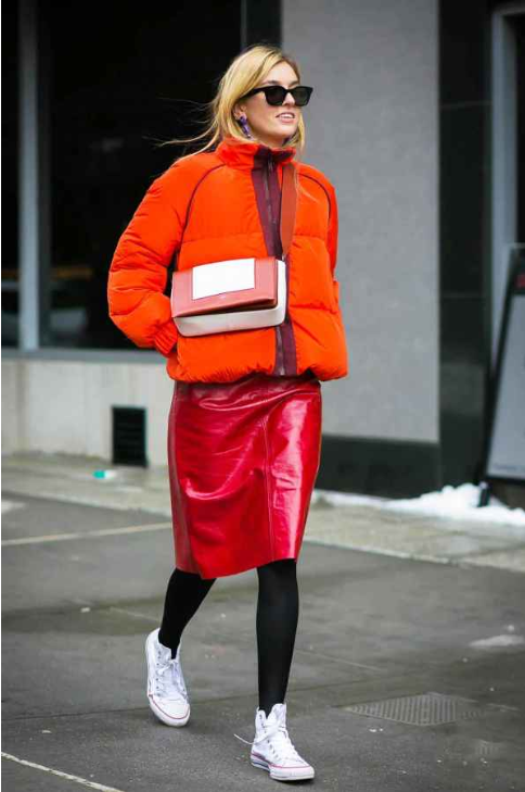 1. 红色的的半身裙子搭配一条黑色的打底裤,可以让双腿显得更加修长纤细。