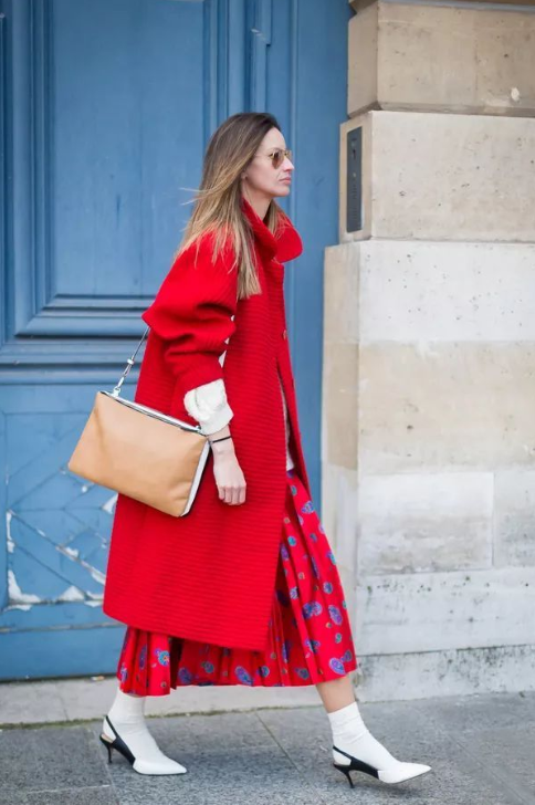 2.红色连衣裙搭配白色短靴,短靴是必不可少的款气质美鞋,白色短靴不仅时尚帅气还十分的百搭。红色碎花连衣裙搭配短款黑色机车皮衣,性感又帅气,一双白色短靴更显成熟优雅气质。