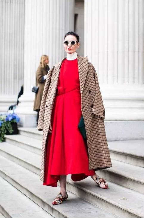 选择格子元素的外套,更具复古时髦感,如果是红色连衣裙的话,直接套上某一件格子外套,颜色就可以很统一,但是如果搭配半身裙的时候,上衣与格子外套最好是属于同类色系的服饰,会更加的和谐。