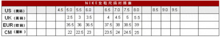 女鞋美码4.5、5.5、6.5、7、8、9分别对应国内的35、36、37、38、39、40。