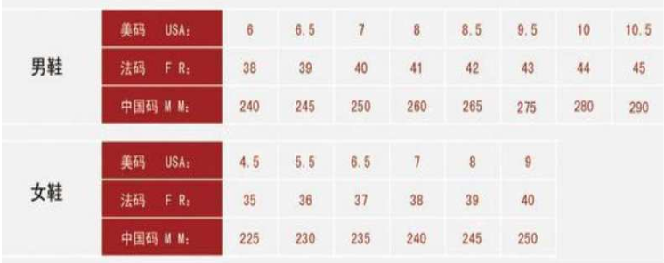 aj鞋子是用的美码,6美码等于中国码240,6.5美码等于中国245码,7美码等于中国250码,8美码等于中国260码,8.5美码等于中国265码,9.5码等于中国码275码,10美码等于中国280,10.5美码等于中国290。
