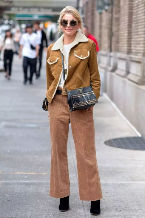 灯芯绒面料本身就有一定的厚度,保暖性很好,竖条纹的灯芯绒裤子会让腿型看起来笔直修长,穿上身很显气场。但因为本身就比较厚重,要注意避免选择裤管过于款式的款式,或太过厚重的穿搭,导致身材比例失衡。