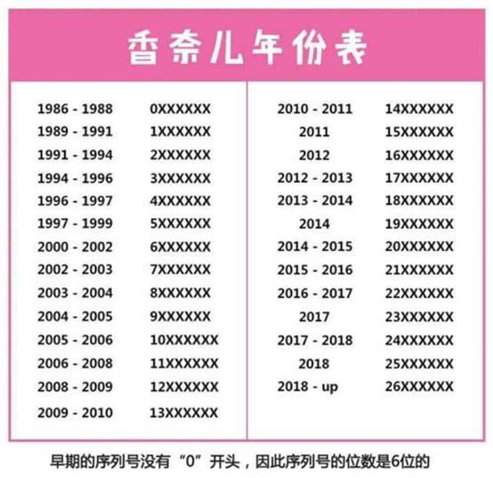 综上所述,从1986年到2005年,Chanel就开始使用0~9不同的数字开头代表不同的生产年份。从2005年至今,Chanel开始使用10~26不同的数字开头代表不同的生产年份。序列号为0XXXXXX的包的生产年份是1986年-1988年。序列号为10XXXXXX的包的生产年份是2005年-2006年。以此类推。