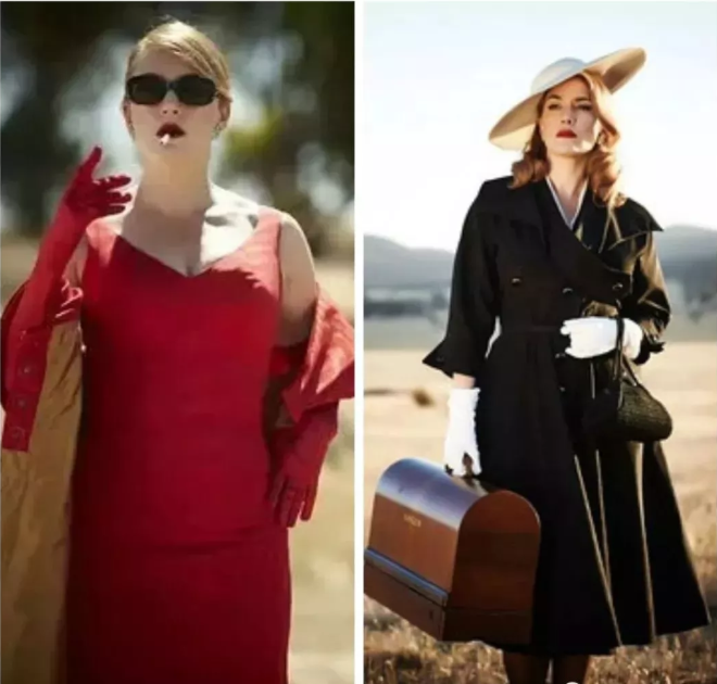 比如上图是电影《泰坦尼克号》的女主角凯特·温斯莱特在电影《裁缝》中的剧照,左图明显看到她是真的不瘦,但是看右图,通过一顶帽子、一条腰带、一副白手套,成功地把自己穿成了一个瘦子。