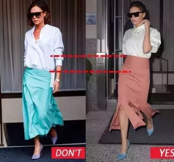 因为过低的腰线会显得整体比例失调,甚至显矮10cm,关键是会出现一种“向下”的感觉,看下面这张图你就懂了。