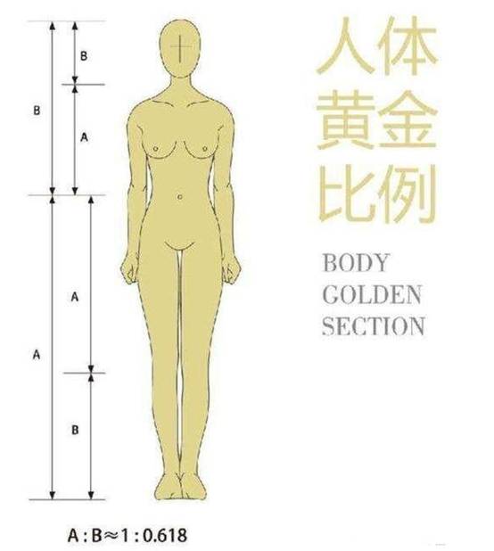 以女性的肚脐为分界线,上身和下身的比例为5:8,这样就是黄金比例,通常用八个头部的长度作为身高的比例.