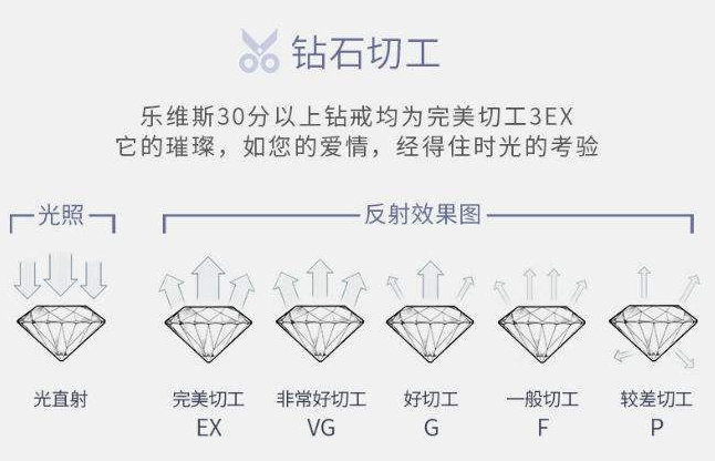 理想切工理想切工(EXCELLENT):代表只有3%的一流高质量钻石才能达到的标准,这种切工使钻石几乎反射了所有进入钻石的光线,一种高雅且杰出的切工。