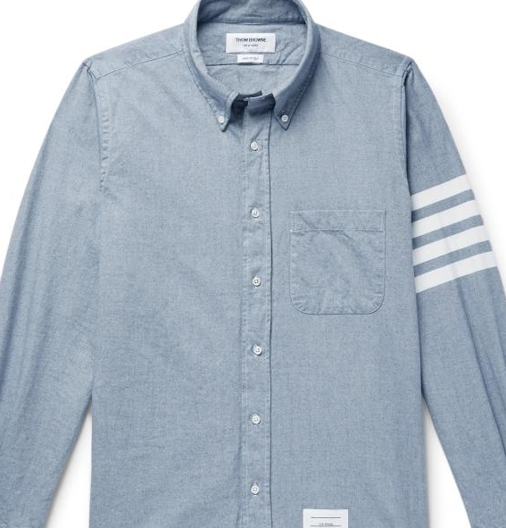 袖子上四条杠的衣服是Thom Browne品牌。汤姆·布郎 (Thom Browne) 男士西装在剪裁与合体度上独树一帜——裤装腰部无腰带绊,而且总是好像小一号的样子,裸露出脚踝;上装的袖口总是短到将衬衫露出3寸,前襟总是3粒纽,窄领,侧边开衩。汤姆·布朗 (Thom Browne) 品牌西装以炭灰色著称,搭配相同布料裁剪的领带,再用银色领带夹、白色衬衫、黑色皮鞋来完成全身搭配。时尚在汤姆·布朗 (Thom Browne) 看来是极富个性化而且服务于穿着者自身的。
