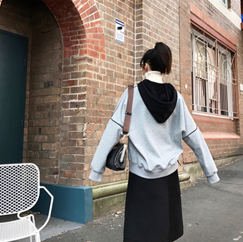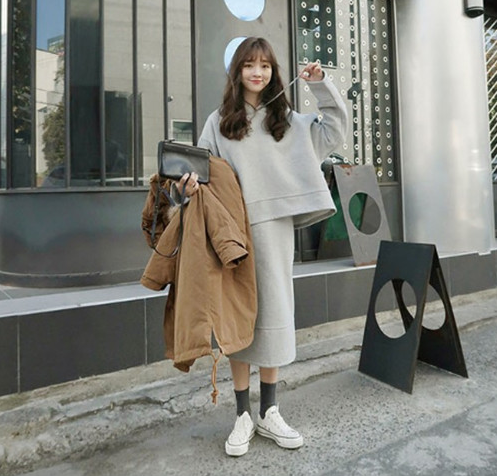 宽松短款灰色卫衣搭配同色配套的卫衣面料半身裙,一秒让你变软妹,给人一种很温柔可爱的感觉,男朋友恨不得都想把你一直紧紧抱在怀里的感觉。