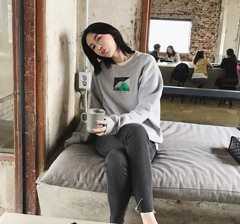 一件简洁的英文的灰色oversize卫衣给人一种偷穿男朋友卫衣的感觉,会显得人非常的娇小,搭配一件黑色皮裤会显得更加有的摩登时尚感。