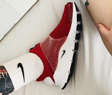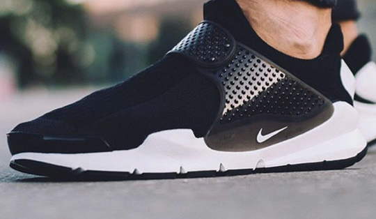 后跟凸起的是“NikeSockDart”。NikeSockDart的编织材质就是轻薄透气的代表。它运用了整体的鞋面编织设计,而在传统的制鞋工艺中,必须要把各部分材质通过粘合、或是缝制来形成鞋面,而且NikeSockDart是Nike史上第一双由电脑编织成型的一体式鞋款,其鞋后跟的凸起部分设计,其实是为了对编织鞋面收口处的遮挡,从而形成了独特的标志性设计。